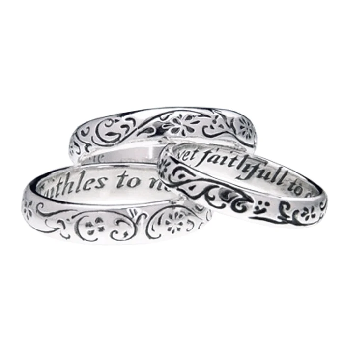 Inscribed “Faithless to none, yet faithfull to one” on the inside with a delicate floral pattern on the outside. From an original gold poesy ring dated to the 16th or 17th century, currently in the collection of the British Museum. Spelling and grammar were inconsistent during this time and the period spelling is charmingly reproduced.